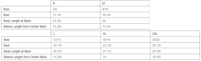 Sizes: Bust: Measured across the chest one inch below armhole when laid flat.Sleeve Length from Central Back: Measure from Center Back neck to shoulder point to sleeve hem.Body Length at Back: Measured from high point shoulder to finished hem at back.